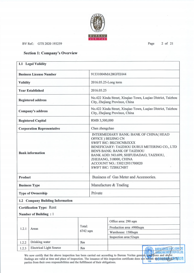 Factory assessment report of Taizhou Durui Metering Co., Ltd